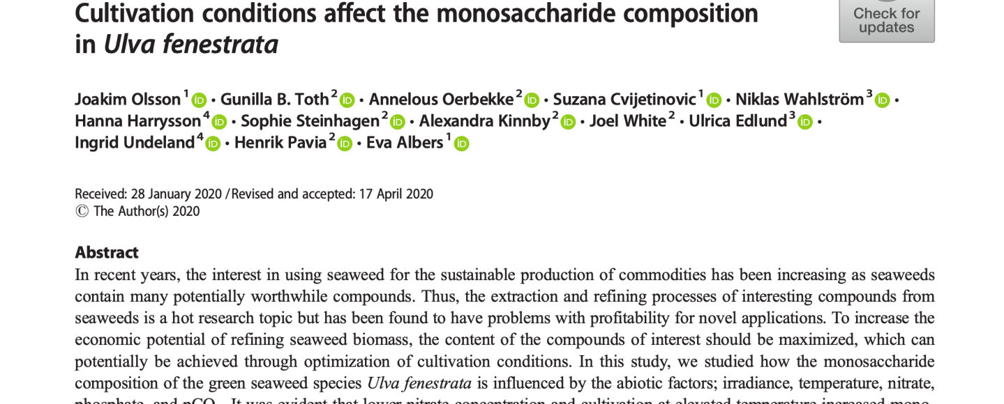 The sustainable production of alternative commodities is one of the world’s biggest challenges. Within our new publication, “Cultivation conditions affect the monosaccharide composition in Ulva fenestrata“, we show that variations in cultivation conditions affect the monosaccharaide composition in the northern hemisphere sea lettuce, Ulva fenestrata.